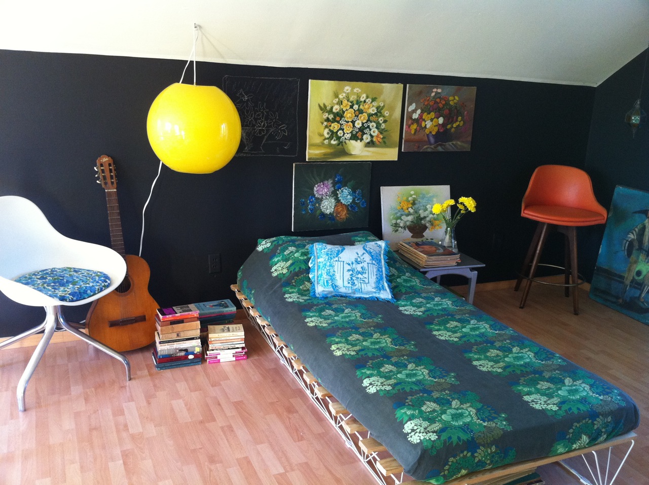 I thought I was going to paper the wall behind the bed with a patchwork of wallpaper scraps. It ended up not working out. Instead I did this.